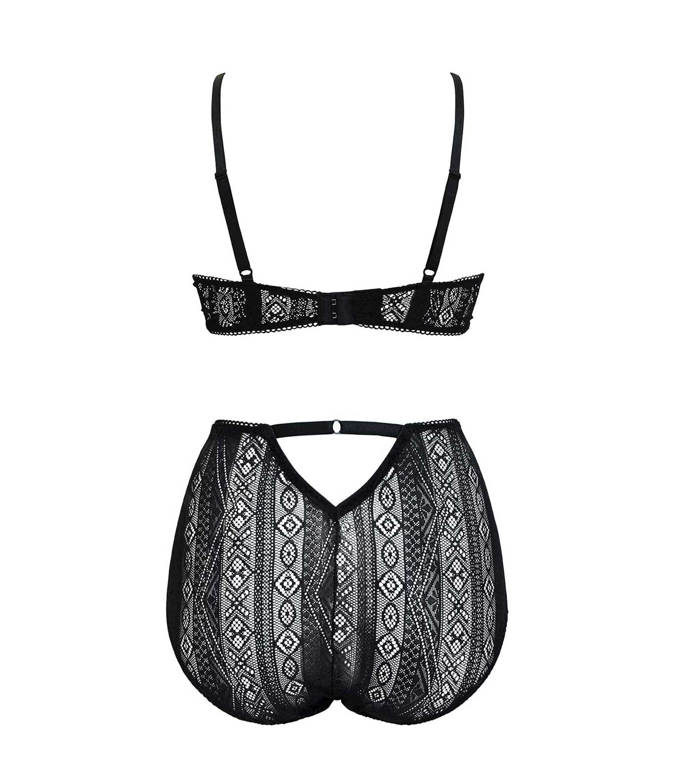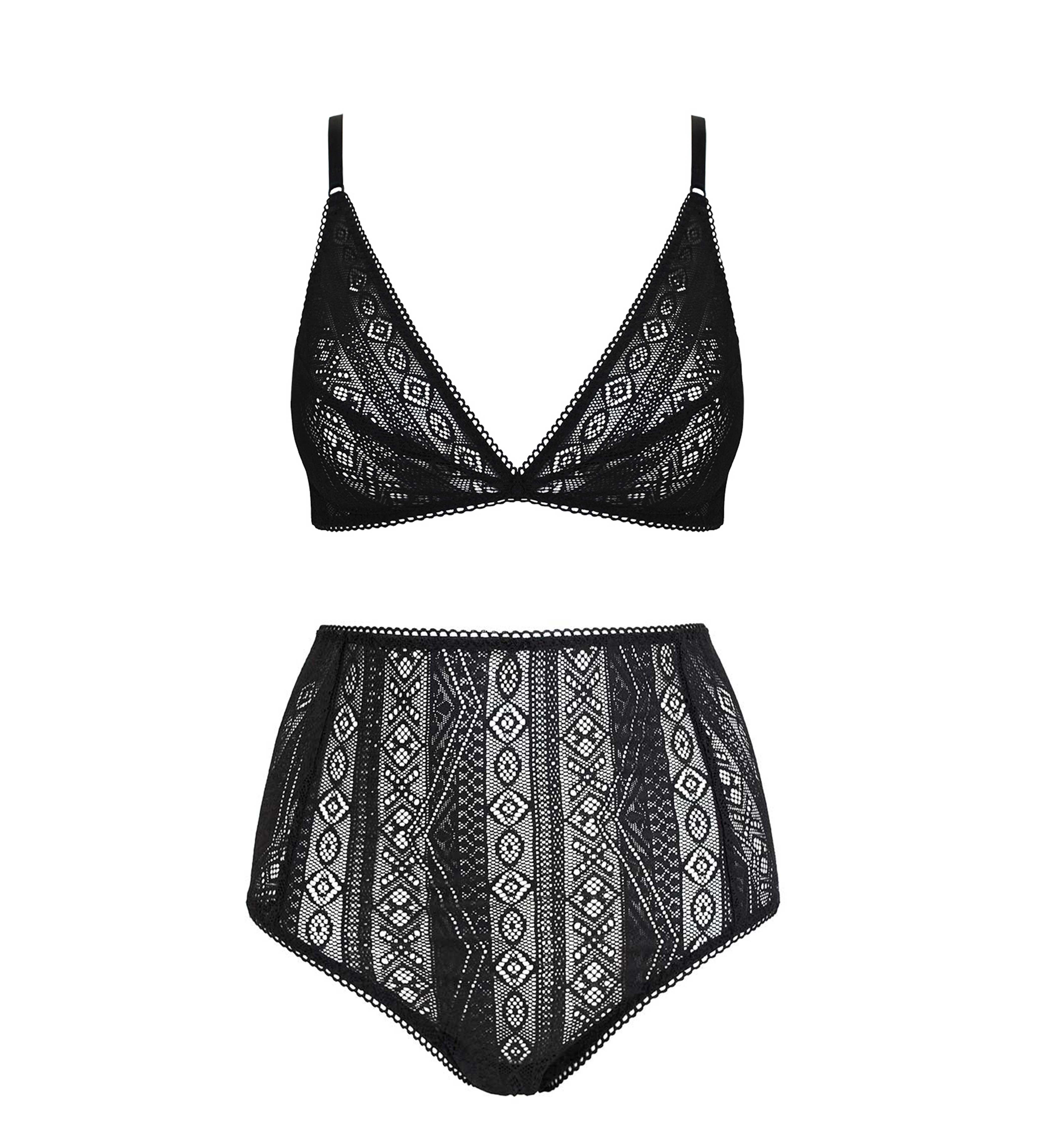 Weicher Soft-Cup-BH der hoch über das Dekolleté reicht, kombiniert mit High-Waist-Slips mit raffiniertem Cut-out-Detail am Rücken. Die geometrische Spitze ist weich, elastisch und angenehm zu tragen, zeigt genau die richtige Menge Haut und schmiegt sich an den Körper an, um deine natürliche Form zu betonen. Der BH ist ungepolstert und ohne Bügel gefertigt und verfügt über einen verstellbaren Rückenverschluss sowie verstellbare Träger.