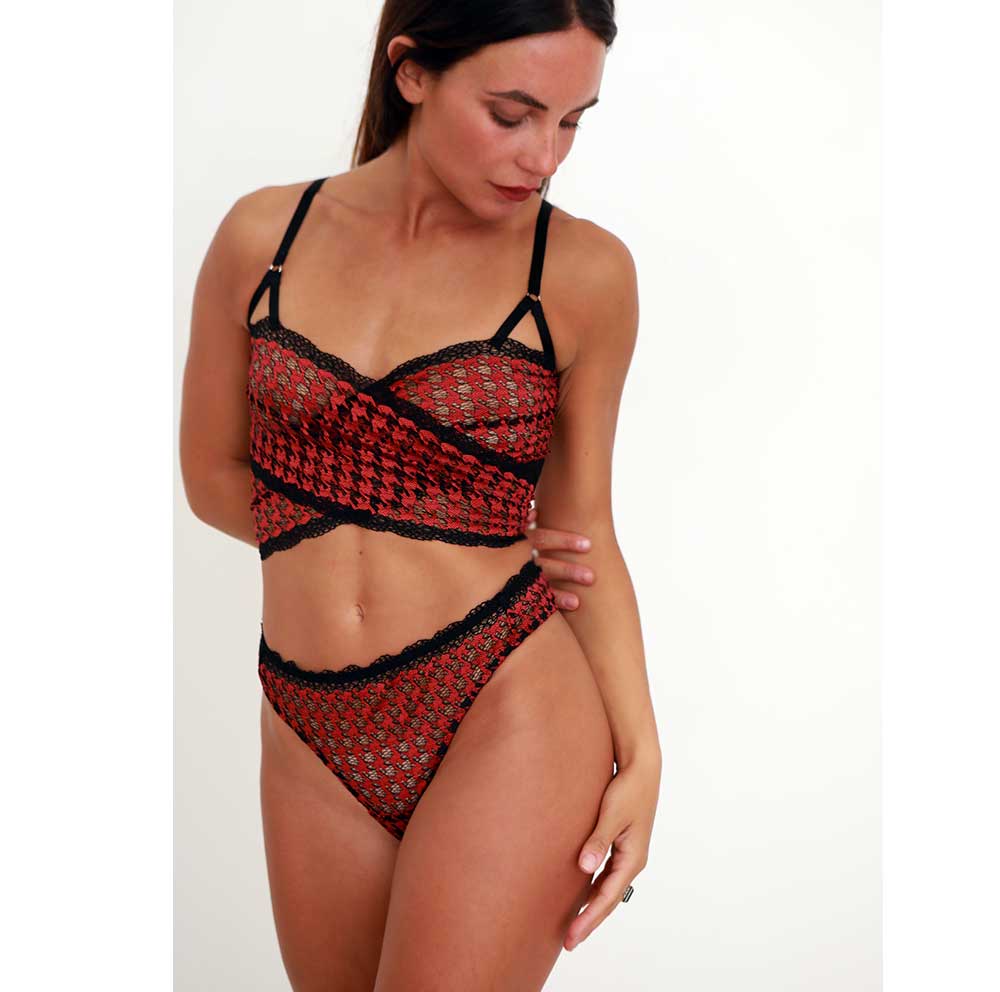 High comfort with a dash of romance and extravagance, this non-wired bralette is designed with a casual wrap front and closes in the back, making you feel gently yet firmly held in all the right places. It is spiced up with strappy details at the front cups and feature adjustable shoulder straps and seamless decorative edges that forms along your natural shape. The Dharma bralette matches perfectly to Dharma red thong crafted in the same lace but can also creatively compliment a mix and match style choice.