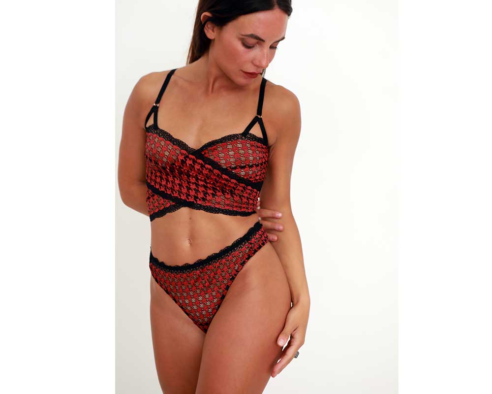 High comfort with a dash of romance and extravagance, made from a stretchy lace, the Dharma thong is soft and sensual to wear. A decorative lace edge lines the top hem, gracing the hips gently. With it’s special houndstooth pattern, the Dharma thong matches perfectly to Dharma red bralette crafted in the same lace but can also creatively compliment a mix and match style choice.