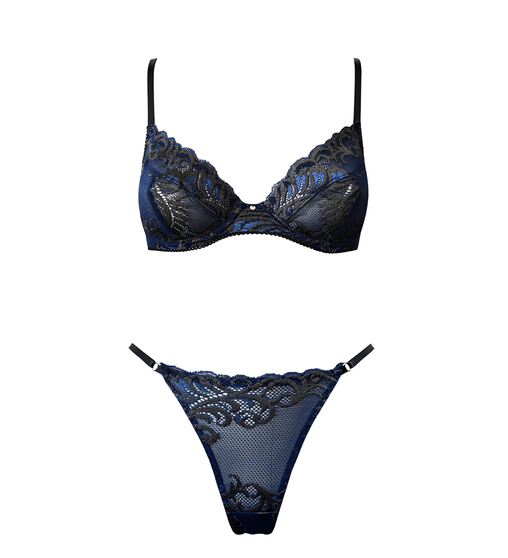 Saga is our first underwire bra, a timeless beauty created to give great support while still being comfortable to wear as all our other bras in the collection. The cups are cut low for a graceful chest and the navy floral lace has a subtle shine in it, which combined with the black straps creates a classic and sensual vibe. The back is finished with straps that leaves great room for adjustment, turning out to be the perfect fit for your individual underbust width.